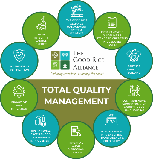 To ensure the seamless implementation of the program and its true purpose, The Good Rice Alliance Management System (TGRAMS) has been developed. This system acts as a lynchpin, guaranteeing the delivery of optimal outcomes, including the issuance of carbon credits. It operates in alignment with programmatic guidelines and SOPs, ensuring a standardized and effective approach.